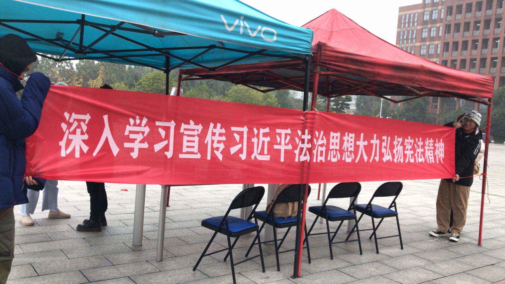 在校内宣讲活动中,协会志愿者在早上7点,就积极进行各项准备工作。他们满怀热情与期待,采取设立法律咨询点、发放普法宣传手册、摆放宣传展板,悬挂横幅等多种形式开展宪法宣传;上午10点,宣传活动在立言楼前坪、北校工行门口、南校三角坪正式开始,吸引了许多师生前来沟通、咨询。志愿者用具体的法律案例讲解抽象的法学理论与法律知识,让前来咨询的同学们能听得懂、记于心。
