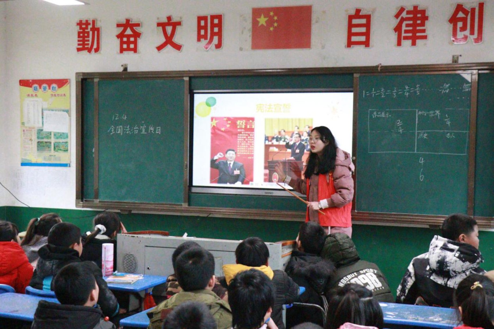 下午13:30,法律协会青少年普法小组前往湘潭市九华中心小学,开展以“宪法与儿童”为主题的法治宣讲活动。协会志愿者李诗韵、李娜等同学,在课堂上用生动的语言向小学同学们讲述了宪法在我们的生活中所起的作用,让小学同学能够更加形象地理解宪法知识。