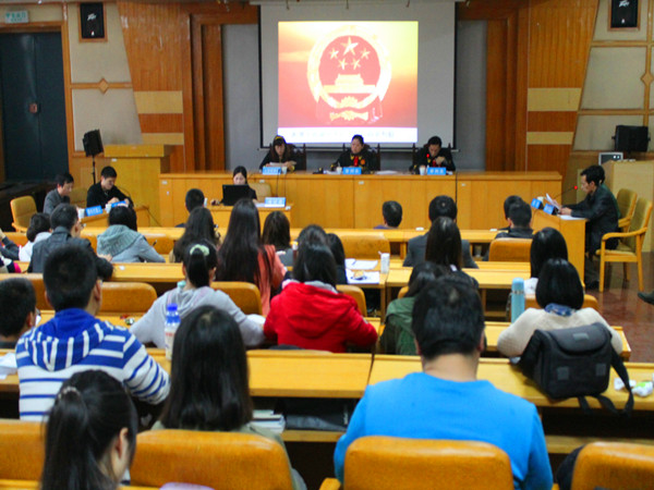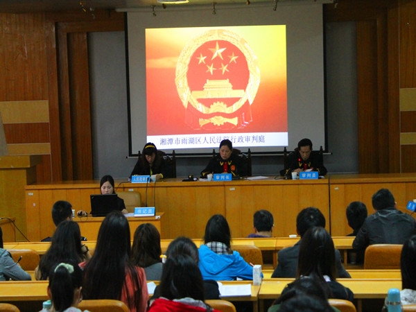 | 4 月24日 上午九点,湖南省湘潭市雨湖区法院行政审判庭在我校五教2—4进行行政诉讼案件的开庭审理,芭乐视频