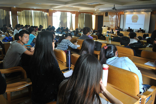 法学院主办、法律协会承办,法学院法律系刘敏老师、 2012 级同学等百余名师生到场旁听。 庭审开始之际,书记员用庄严、肃穆的声音宣读法庭纪律,真实的还原了庭审现场。专属于法律的魅力深深的吸引住了在场的每一位同学,让他们都能真切的感受到法庭的庄严。法锤落下,由审判长宣布开庭,整个庭审期间,庭审都严格按照法律程序进行。 庭审结束后,刘敏老师表示,通过参加公开庭审,让同学能以最真实的方式去接触法律,减少了只是单纯书本教学带来的不足,可以更加好的提起同学学习法律的热情,案件内容虽然简单,但是却严格依照民事庭审程序进行,有利于同学更好的理解庭审程序。 12 级法学专业的同学张文说道:“这次的旁听很有意义,让同学们增长了不少法学实践知识,同时我也感觉自己的法律学习之路任重道远,需要不断努力。” (责任编辑:admin) |