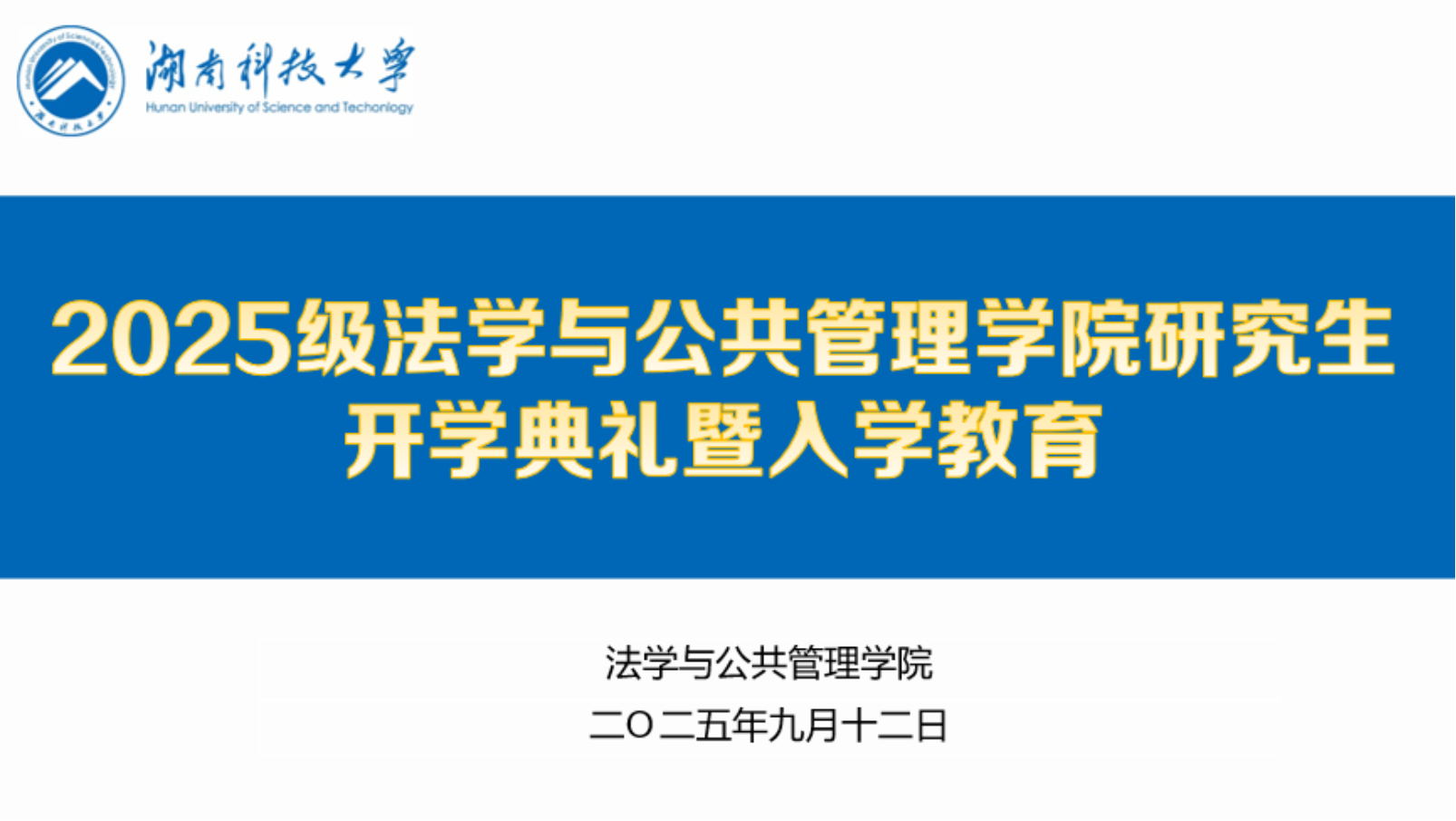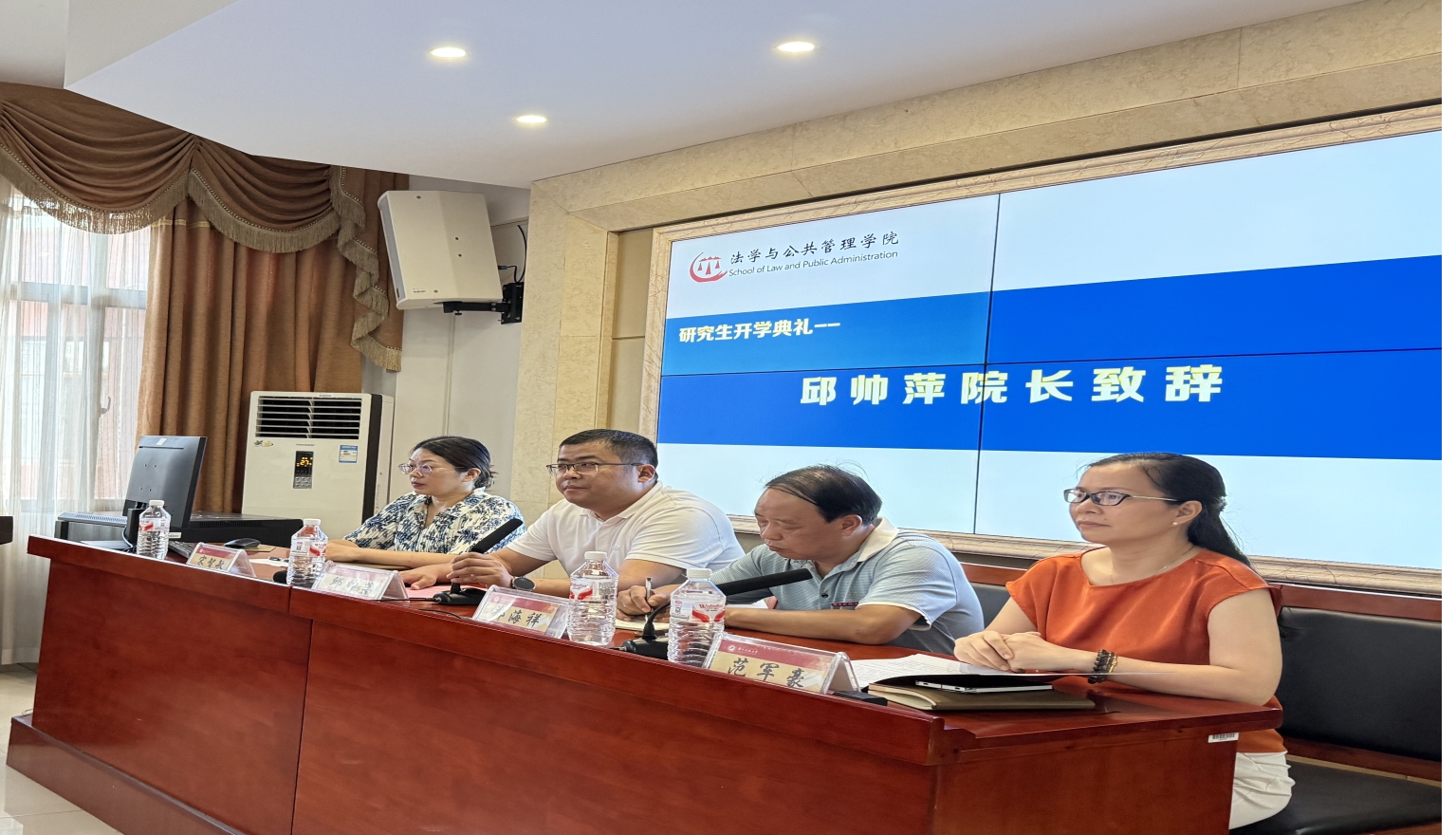 于立言楼A425隆重举行2025级研究生开学典礼暨入学教育。学院院长邱帅萍、党委书记郑海祥、副院长宋智敏、党委副书记范军豪,法学硕士学位点负责人雷连莉、法律硕士学位点负责人朱红梅,研究生辅导员郭志军、研究生秘书邓慧,研究生导师、授课教师及全体2025级新生参加此次活动。
