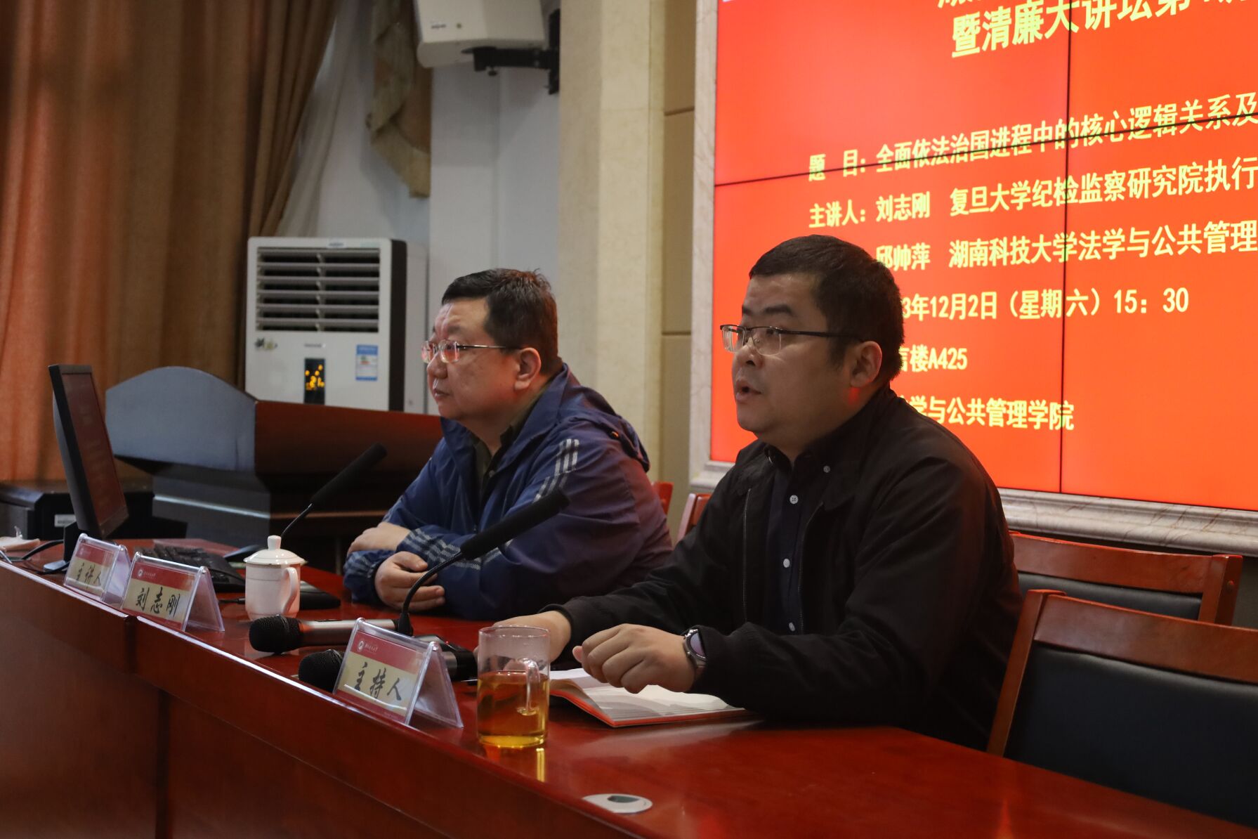 2023年12月2日下午,复旦大学纪检监察研究院执行院长、教授,博士生导师刘志刚教授应邀在立言楼 A425举行湖湘法治论坛第113讲暨清廉大讲坛(原湖湘纪检监察论坛)第4讲,讲座题目为全面依法治国进程中的核心逻辑关系及其展开。出席本次的讲座有芭乐视频