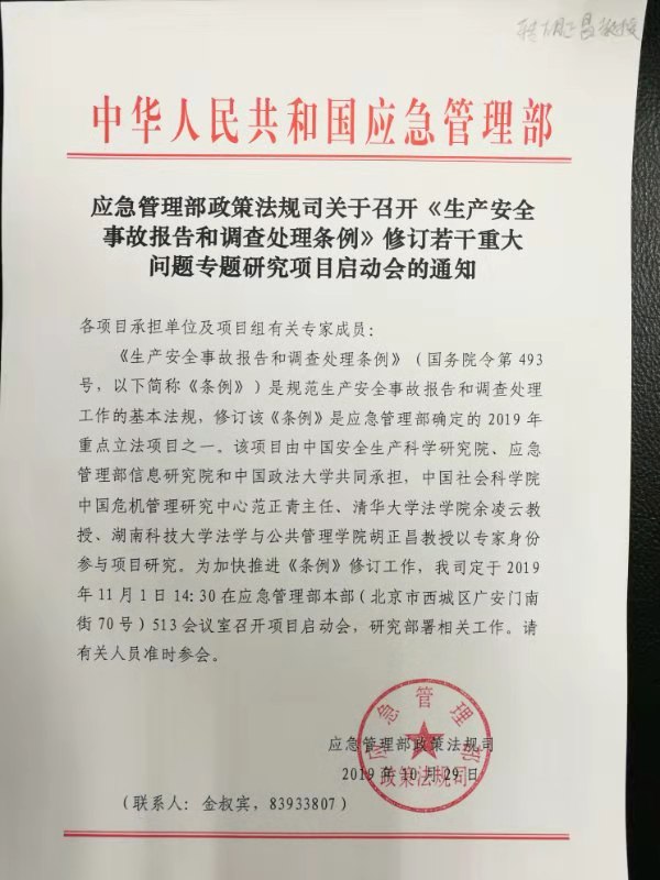 11月1日,应国家应急管理部政策法规司邀请,胡正昌教授与中国社会科学院中国危机管理中心范正清主任、清华大学法学院余凌云教授以专家身份参加了《生产安全事故报告和调查处理条例》立法修改研讨。该条例是《国家安全生产法》的重要配套行政法规,实施12年来,存在诸多与现实不适应之处。修改该条例是应急管理部确定的2019年重点立法项目之一。会上,胡正昌教授提出《生产安全事故报告和调查处理条例》修改需以上位法《国家安全生产法》内容为依据、条例修改需进行广泛实证调研、立法修改项目合作单位需充分协商沟通以保证立法质量等建议,受到与会领导和专家的肯定。