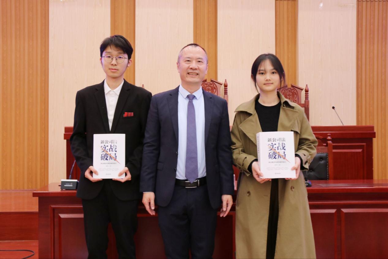 全体学生接受陈科军学长捐赠的《新公司法实战破局:争议解决与典型案例指引》。接过厚重的书籍时,两位代表深深鞠躬,目光中饱含敬意与感激。他们双手捧着的不只是凝聚着学长实战智慧与行业经验的专业书籍,更是校友对母校学子的深切期望与学术薪火的传承。现场掌声如潮,见证着这份跨越时空的校友情谊,也让“感恩反哺、笃学奋进”的种子在学子心中默默扎根。