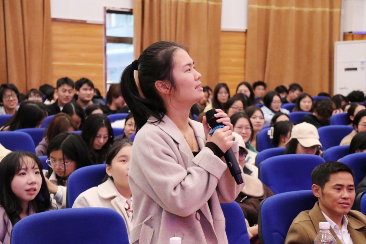 在互动提问环节,台下同学和校友代表张扬学姐积极提问,就法律学习中的实务难题与理论疑问向陈科军师兄求教。陈科军师兄认真倾听,凭借自身经验和专业知识一一解答,从公司法条文运用到职业发展计划,其细致的回答使在场师生、校友在解惑中加深了对法律实务的认识,现场互动气氛热烈且和谐。