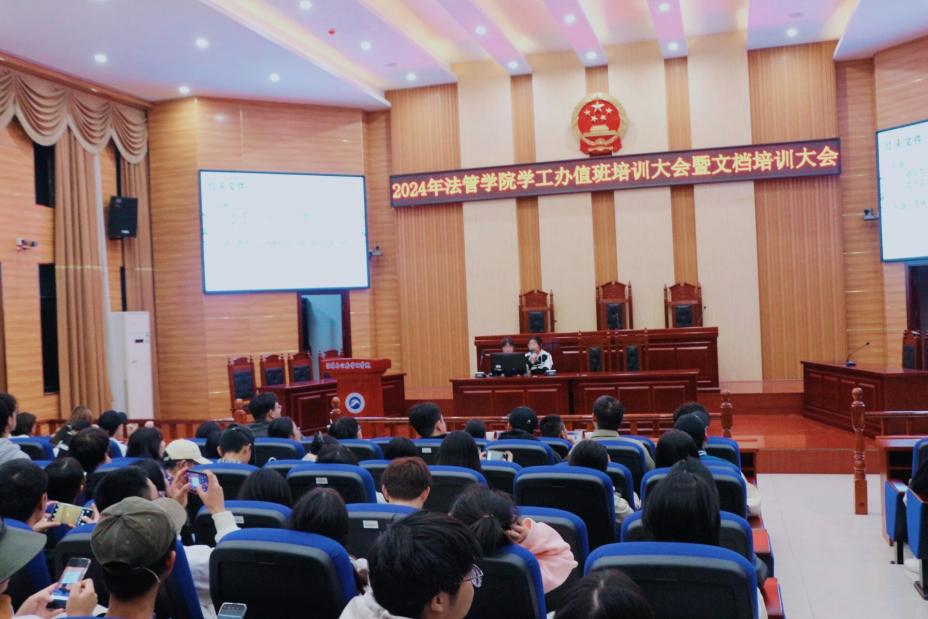 第九届团委学生会学工办值班暨文档培训大会于立言楼3-2模拟法庭召开。党委副书记范军豪、学工办主任郭志军以及2023、2024级全体学生干部参会。