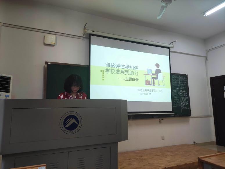 随后20级公共事业管理专业班主任戴年红老师发言,为同学们更深层次地讲解审核评估的重要性,以及审核评估的相关知识。戴老师提问到,我们在审核评估过程中能做什么、应做什么?同学们积极参与互动,纷纷表示需要提高到课率、需要提高上课专注度、需要履行好大学生本职等等。