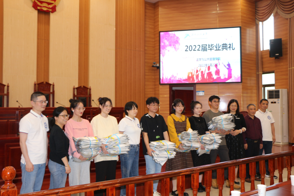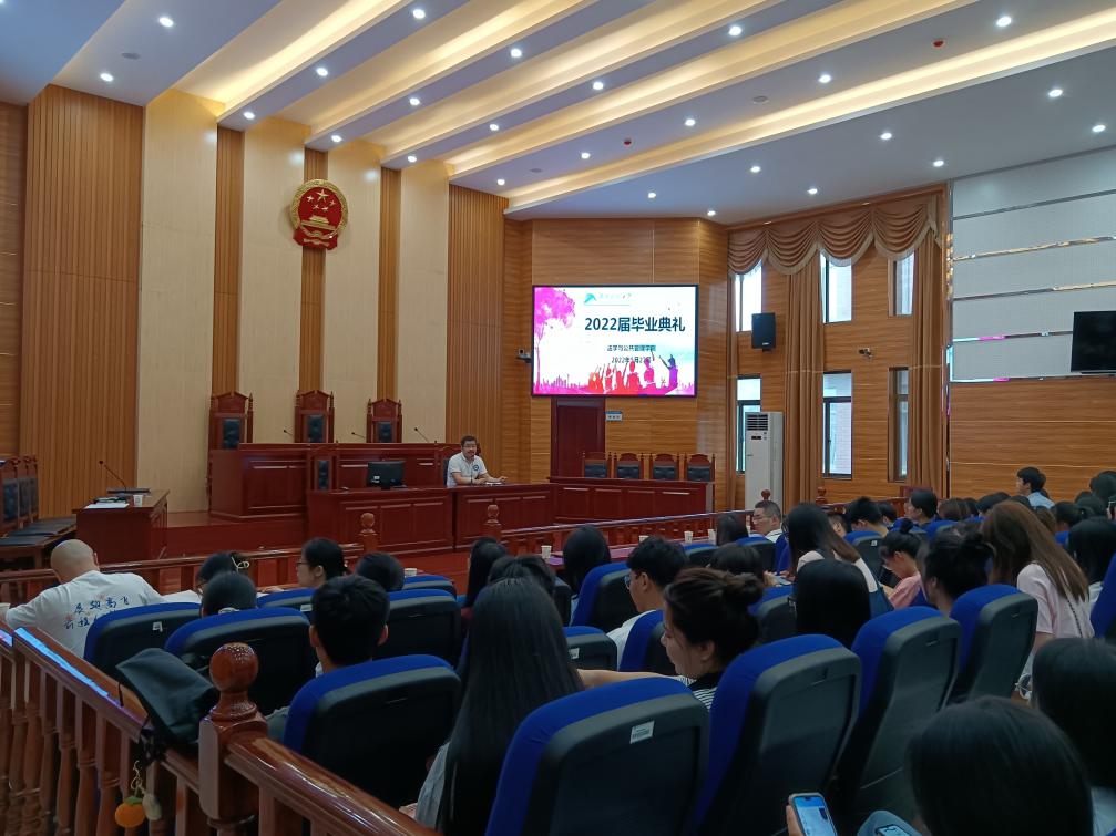 于立言楼3-2模拟法庭举办了18级毕业生毕业典礼。本次会议有学院党委书记邱帅萍,党委副书记叶军,副院长宋智敏、王明,法律服务中心主任马驰升,系主任吴四江、戴年红,原学工办主任朱荣,辅导员李斌等领导及老师出席。全体18级毕业生参会。本次毕业典礼由叶军副书记主持。