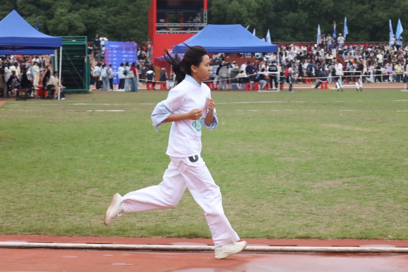选手石浩楠正全力腾跃,他弓身展腿,运动鞋离地的瞬间带着破风的势头,身后的看台人声鼎沸,同院的伙伴们举着号码牌张望,背景里的宿舍楼仿佛也在为这场青春的冲刺作见证。每一次蹬地、每一次腾空,都是他为学院拼尽全力的注脚。
