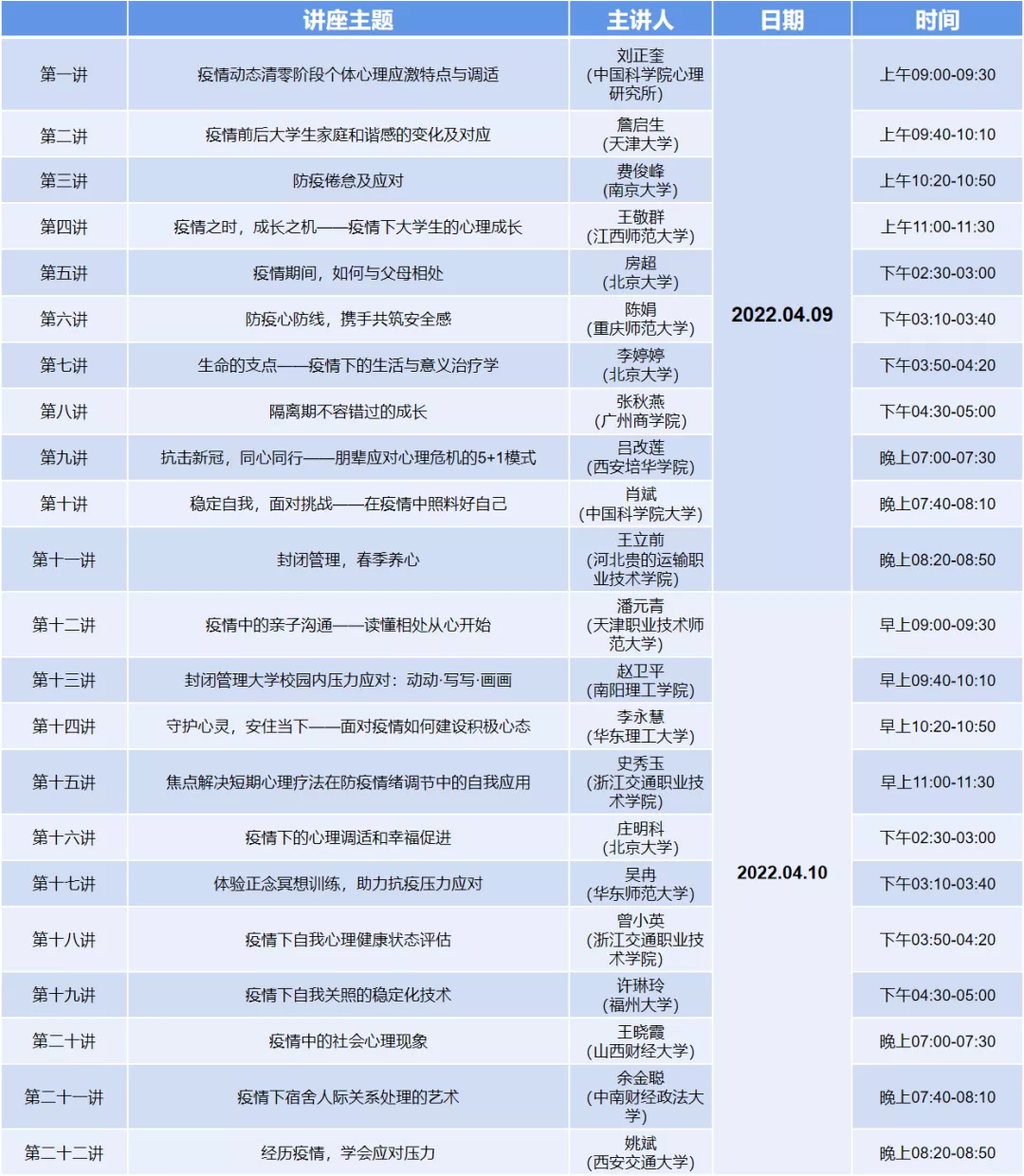 随着全国多地陆续发现多起新型冠状病毒肺炎确诊病例,各地纷纷实行封禁政策,在校大学生群体中出现诸多心理健康问题,因此,中国心理学会心理危机干预工作委员会及全国高校心理委员研究协作组织于2022年4月9-10日面向全国高校学生开展“抗击疫情全国心理委员大讲堂”系列公益讲座。芭乐视频