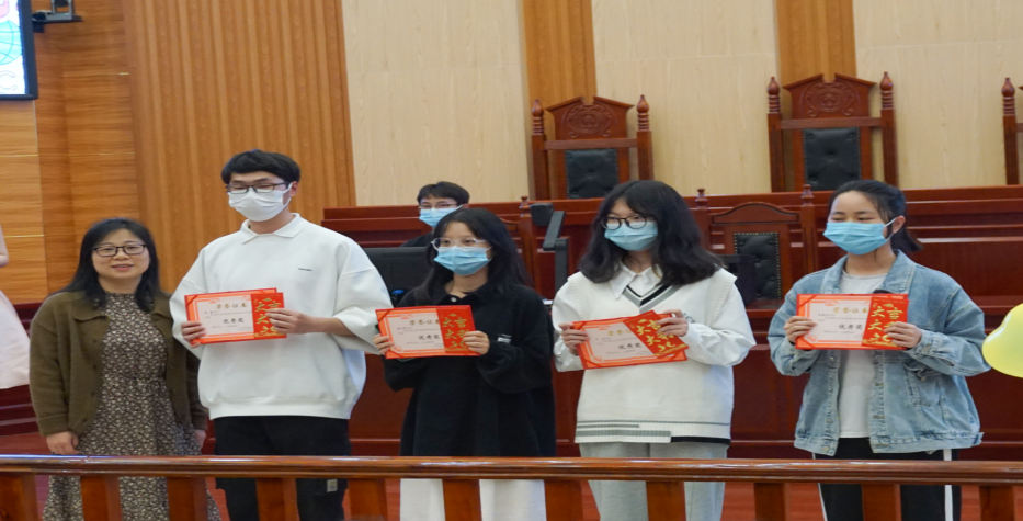 随后,主持人介绍了本次获奖的个人和班级。四级获奖学生是罗寒宇、邓思、潘立华和陈鑫,六级获奖个人是黄达、姚琼、罗寒宇和周乐妍。四六级通过率优秀班级为19级法学一班和20级法学四班。叶军副书记、吴四江老师、朱荣老师分别为四六级高分学生和优秀班级进行颁奖。颁奖环节结束后,会场上爆发了热烈的掌声。