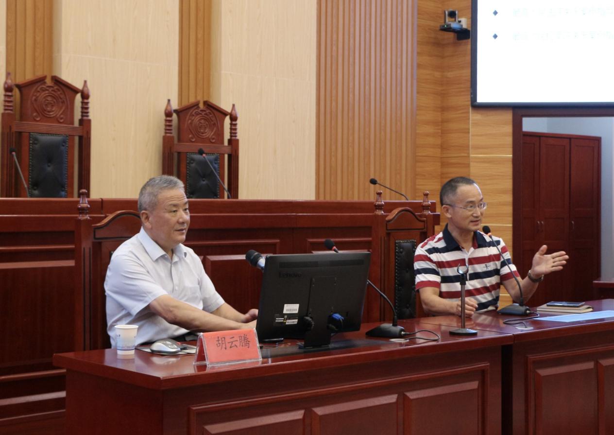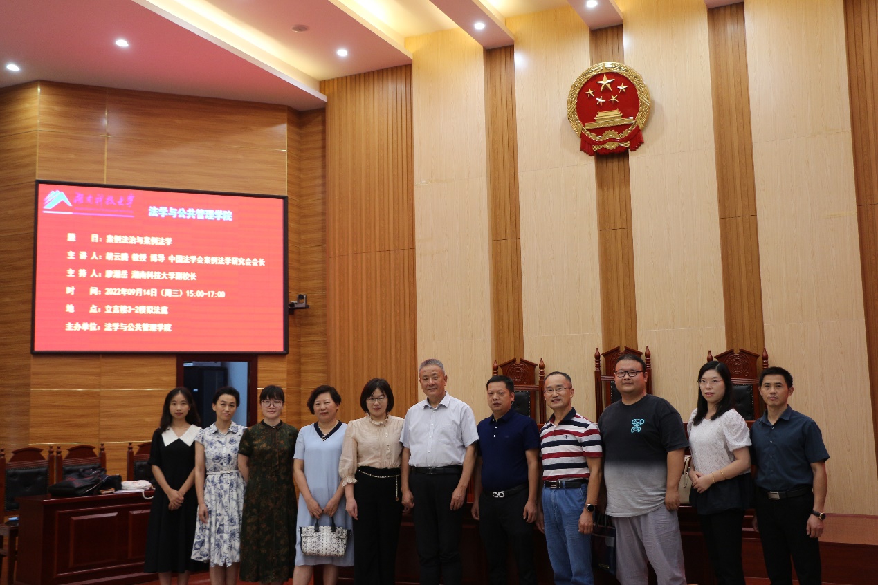 湘江高端学术论坛在立言楼模拟法庭举办。中国法学会案例法学研究会会长、最高人民法院二级大法官、最高人民法院审判委员会原副部级专职委员胡云腾教授应邀出席论坛并做“案例法治与案例法学”主题讲座。
