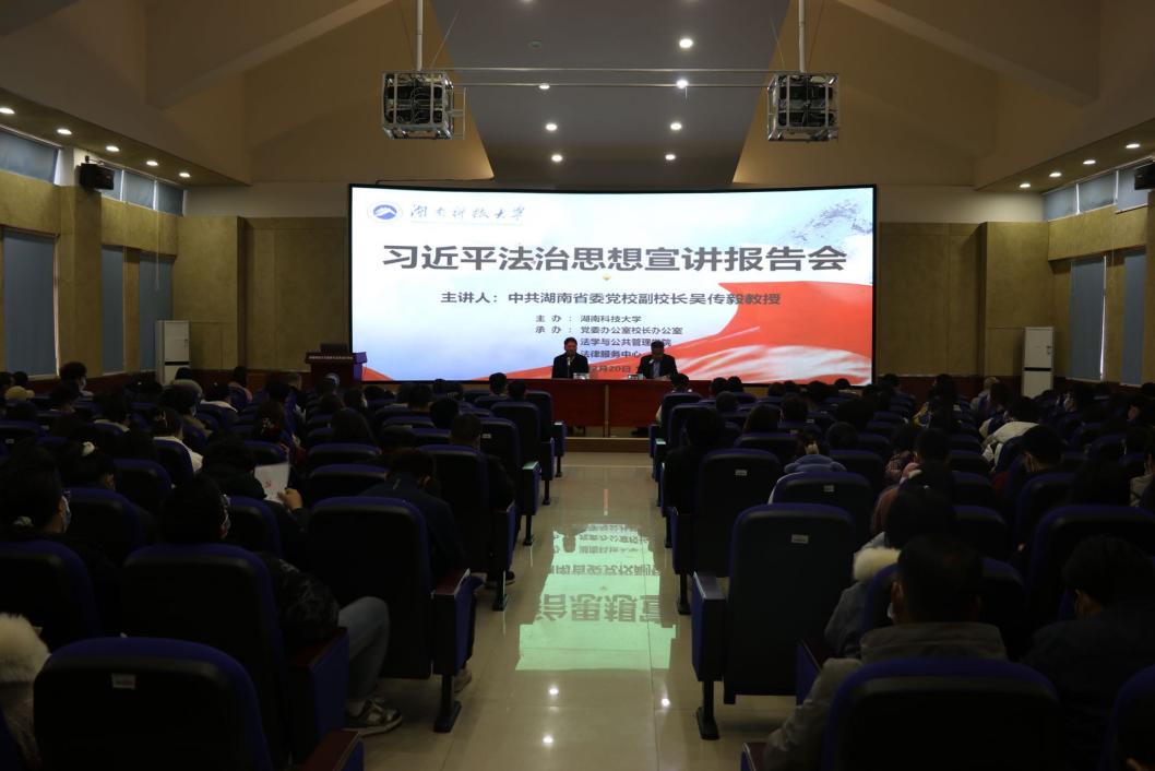 2021年12月20日下午,我校在立志楼5-2多媒体中心主办了一场主题为“学习领会习近平法治思想”的宣讲报告会。报告会由中共湖南省委党校副校长吴传毅教授主讲,我校副校长廖湘岳教授主持,全校各学院老师、研究生和本科生代表200多人到场聆听学习。