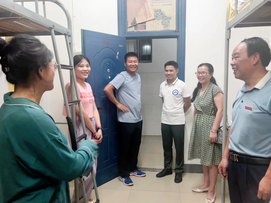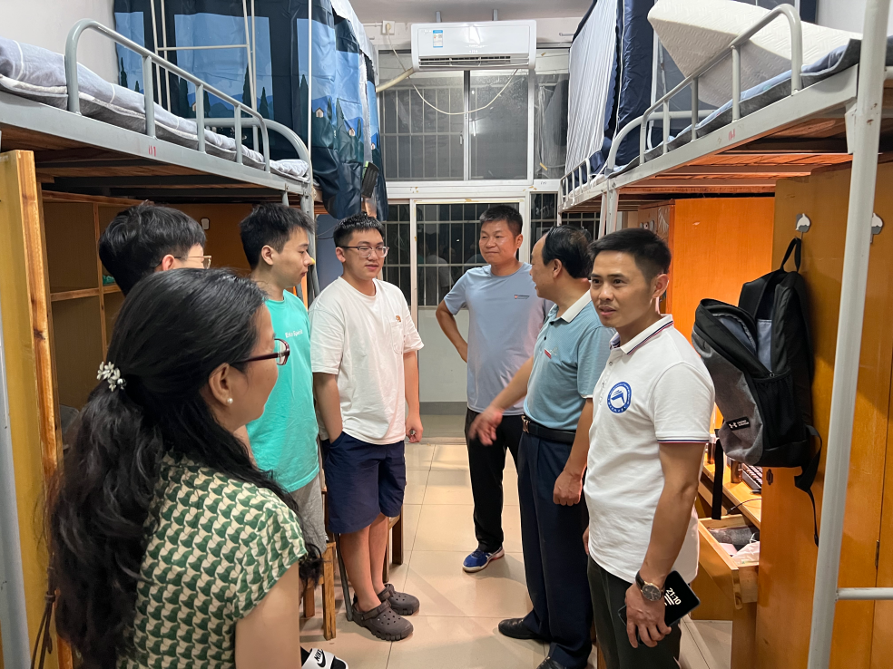 2023级研究生都已完成开学报到手续并顺利入住寝室。为了解新生的学习生活状况,学院书记郑海祥、副书记范军豪、副院长王明、辅导员郭志军老师于16日晚20:00下寝慰问。郑海洋书记和诸位领导首先为诸位新生的到来表示热烈欢迎,同时也为新生答疑解惑,提醒新生注意宿舍安全,防火防盗,警惕信息诈骗等,并强调新生要严格遵守学校宿舍的规章管理制度,共同创造安全、稳定、和谐的寝室环境。其间,郑书记亲切地询问了新生们的基本情况,以及是否适应新环境,有没有遇到什么困难等问题,进一步拉进了和同学们之间的距离,充分的展现了学院的人文关怀,反映了学院对于新生的关注,为新生减轻陌生感、融入校园生活注入了一剂强心针。