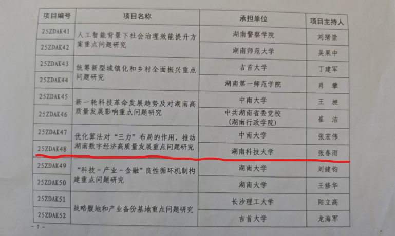 张春雨博士主持的《优化算法对“三力”布局的作用,推动湖南数字经济高质量发展重点问题研究》成功立项2025年度湖南省智库专家服务“十五五”规划重大专题研究项目。