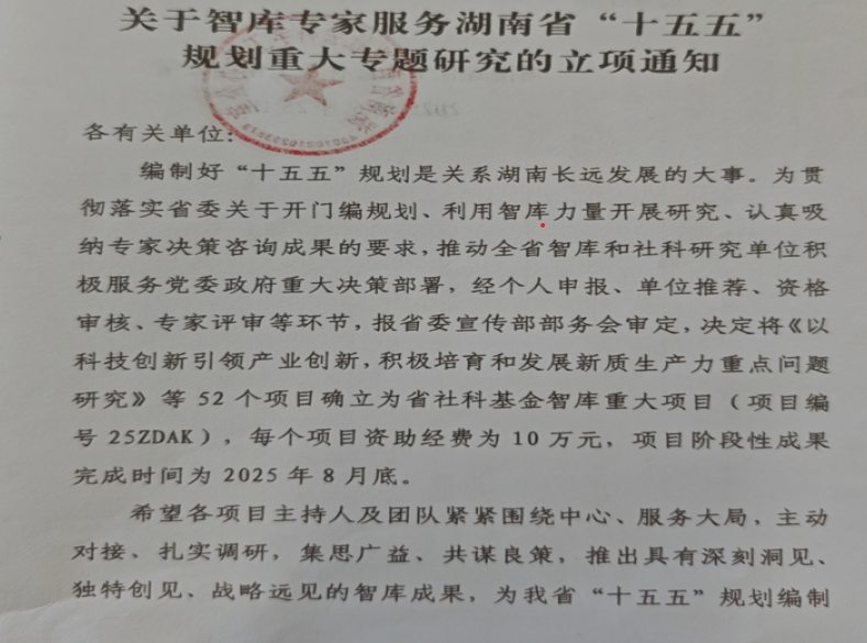 张春雨博士申报的湖南省智库专家服务“十五五”规划重大专题研究项目喜获立项