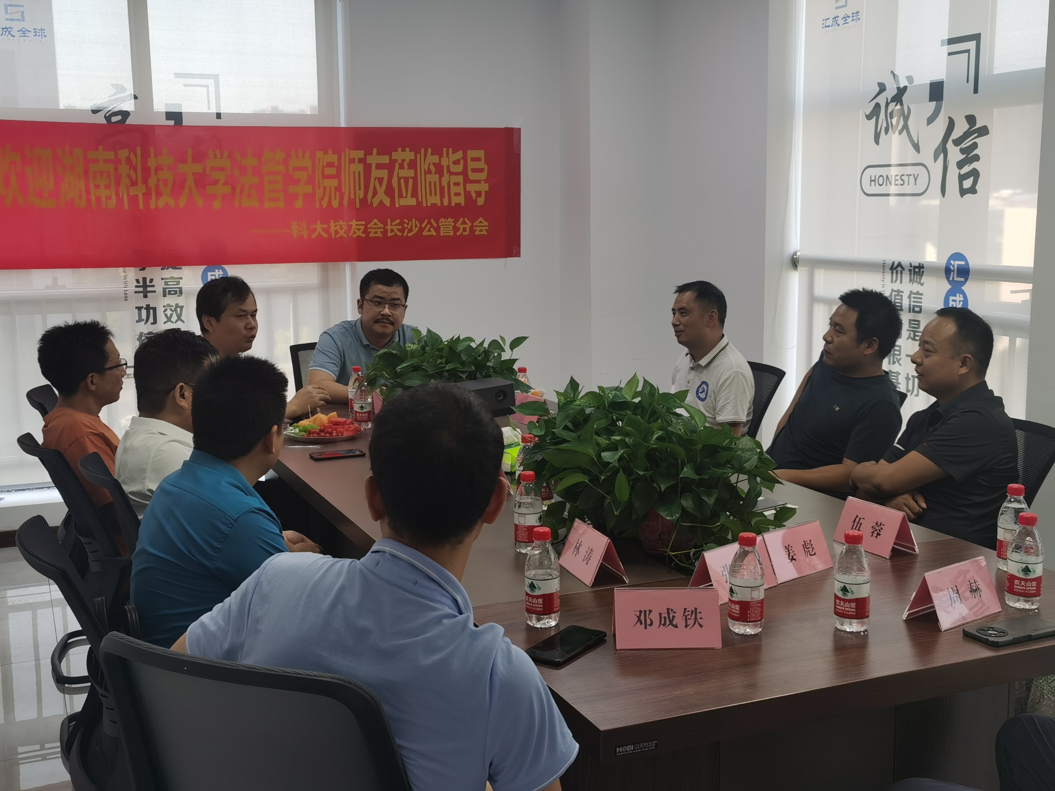 公管专业校外实践、就业及MPA招生宣传,增进校友联系,加强校企交流合作,2022年7月26日下午,学院党委书记邱帅萍、副书记叶军、公管系系主任戴年红和公管专业尚天晓老师等前往长沙汇成全球物流有限公司等企业单位走访公管校友,与科大长沙校友会秘书长侯圣烨、公管校友分会会长郭大平、公管校友分会秘书长邓成铁及多位公管校友代表开展座谈交流。