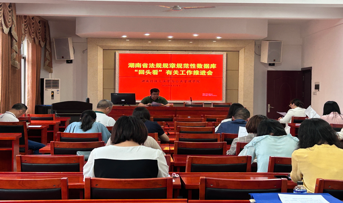 在立言楼A425召开湖南省法规规章规范性数据库“回头看”有关工作推进会。会议由院长邱帅萍教授主持,副院长、省人大常委会立法研究基地执行主任宋智敏教授、校法务中心主任马驰升副教授以及所有法科教师参加了会议。