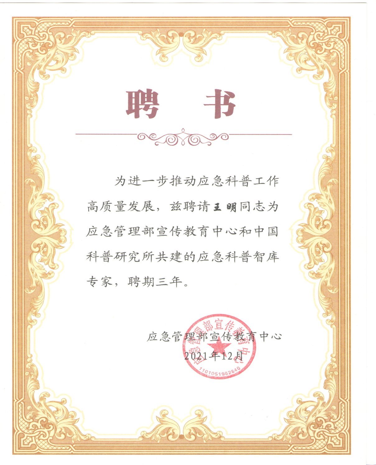 王明副院长获聘应急管理部宣传教育中心应急科普智库专家
