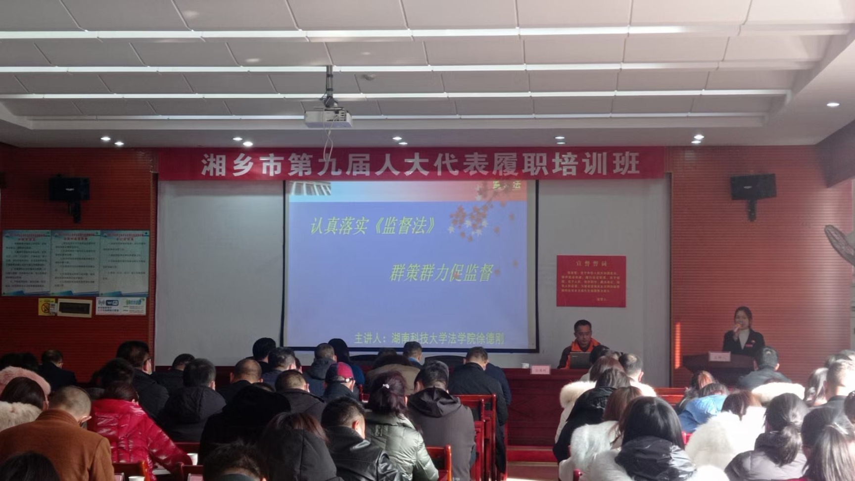 徐德刚教授应邀为培训班人大代表主讲了一堂题为“认真落实《监督法》,群策群力促监督”的法治宣讲课,为人大代表解读了《宪法》和《监督法》的相关内容。湘乡市人大常委会相关领导和本届新当选代表听取了徐教授的讲座。