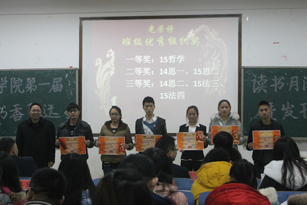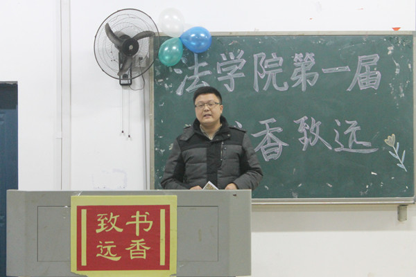 首届读书月活动闭幕式暨发刊仪式    1月6日晚7点,历时一月有余的法学院首届“书香致远”读书月活动闭幕式暨发刊仪式在八教2-3教室举行。到场的嘉宾有院长廖加林、党委副书记叶军、副院长胡正昌,专业老师代表杨盛军、刘鄂、李育军博士和辅导员赵晗冰老师。院团委学生会主席团成员、2015级全体新生以及相关获奖同学到场参加。 “随风奔跑自由是方向,追逐雷和闪电的力量。”在向鹏荻和苗赞杰同学激情澎湃的歌声中,闭幕式正式拉开帷幕。随后,夏菁、沈磊、王雨冰三位同学依次上台,分享自己的读书感悟。王雨冰在谈及自己阅读的《理想国》时说到:“教育关乎民族的未来,若一个国家的教育系统足够完善,它将永远屹立于世界。”随后,老师们分别为读书笔记、读书报告和优秀组织班级的获奖个人和集体颁发了证书及奖品。指导老师李育军博士肯定了同学们参与的积极性,并指出,“读书月活动只是激发大家阅读兴趣的一个契机,阅读,贵在坚持。我们应活到老,学到老,读到老,精读拥有的每一本好书”。 活动最后,廖院长鼓励同学们“应珍惜当下的读书机会,努力做到“转识成智”,理解书中的人生价值和意义,学会面对人生的逆境。书海无涯,读书不止”。 (责任编辑:admin) |