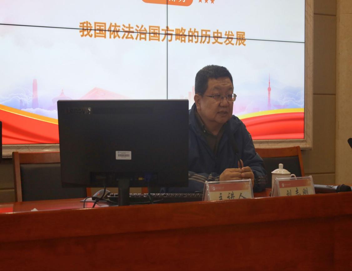 讲座开始刘志刚教授首先讲授我国依法治国方略的历史发展,可以将法治在中国的发展分割为若干个时段,以及讲授了中国在不同的时段法治建设所取到的成效,从1949新中国成立只颁布了宪法和一些重要的法律到如今中共二十大提出统筹推进五位一体总体布局、国家治理体系和国家治理能力的现代化等等,其次刘志刚教授深入浅出讲授了该如何处理全面深化改革和全面依法治国和之间的关系问题,我们要认识到全面深化改革与全面依法治国存在着矛盾,处理这两者关系有三种方法一是改革先行,立法随后跟上,但不符合当下的情形;二是两手都抓,但有可能导致两者的矛盾激化;三是立法先行,改革在立法的框架内进行,但也存在着相应的问题。最后刘志刚教授讲授依法治国与全面治党之间的关系,中国取得一系列的成就,就是因为坚持中国共产党的领导,党的自我革命在不断发展的,全面从严治党永远在路上。从严治党既要利用党规来约束,更要通过法律来规制,所以中国于2018年出台了监察法,协调了全面从严治党与全面依法治国。