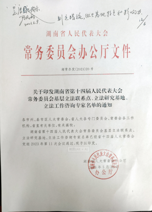 获批湖南省第十四届人民代表大会常务委员会立法研究基地。