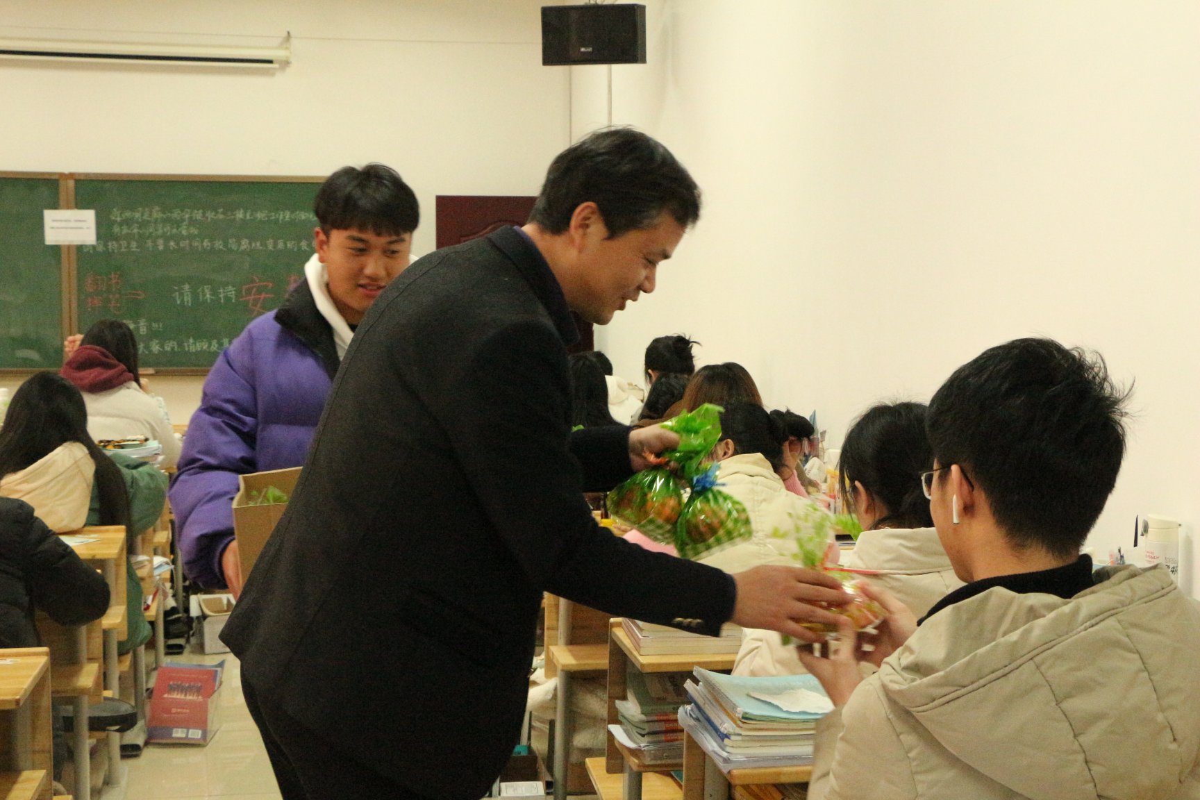 邱帅萍书记亲切的问同学们准备得怎么样、有没有信心,18级学生们笑呵呵地表示“一定会全力以赴”,邱书记更是暖心提示大家考试结束勿对答案、保持心态稳定。叶书记表示,经过长期备战,大家都辛苦了,请大家务必要坚持考完全程,不要轻言放弃,并用之前学长的案例,告诉大家坚持才会有成功的机会。随后,老师们亲手奉上精心准备的心意礼包,并送上满满祝福“苹果代表平(苹)安顺利,橙子代表马到功成(橙),巧克力代表能量满满,里面还有学弟学妹们亲手书写的心意卡片”。