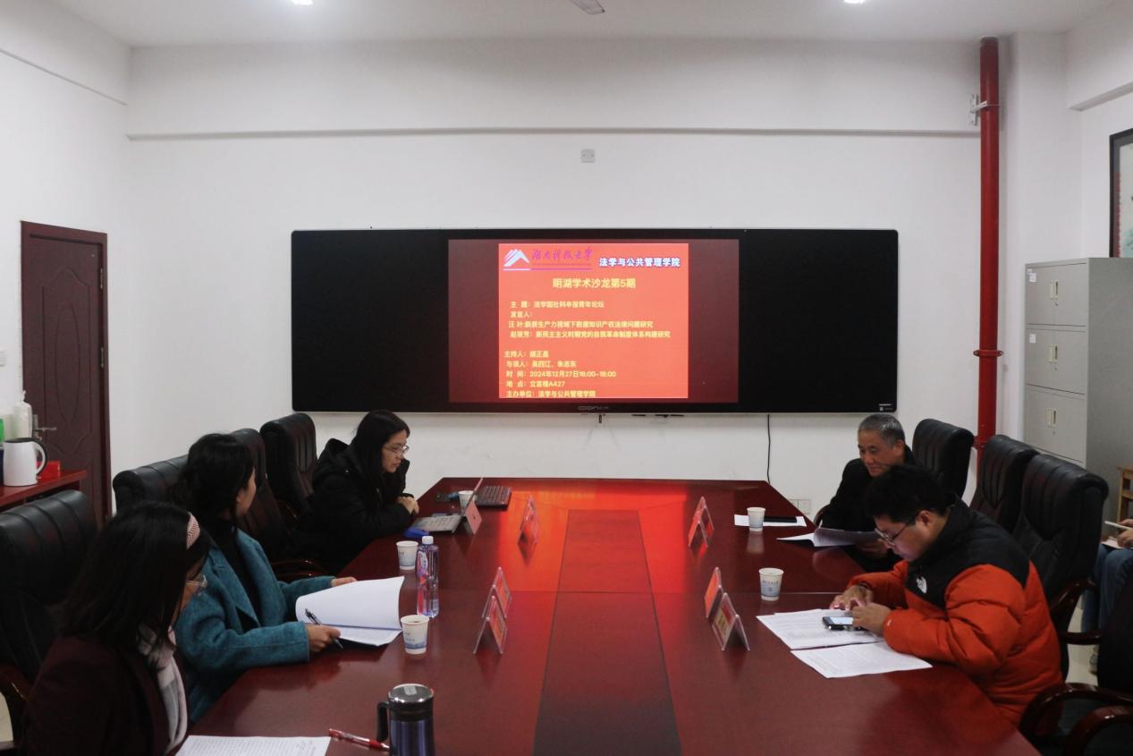 胡正昌教授主持,汪叶、赵筱芳两位青年博士围绕各自的国家社科基金申请书内容做了主题发言,吴四江副教授、朱志东讲师担任与谈人,副院长宋智敏教授、谢潇博士以及24级法律硕士研究生参加了本次活动。