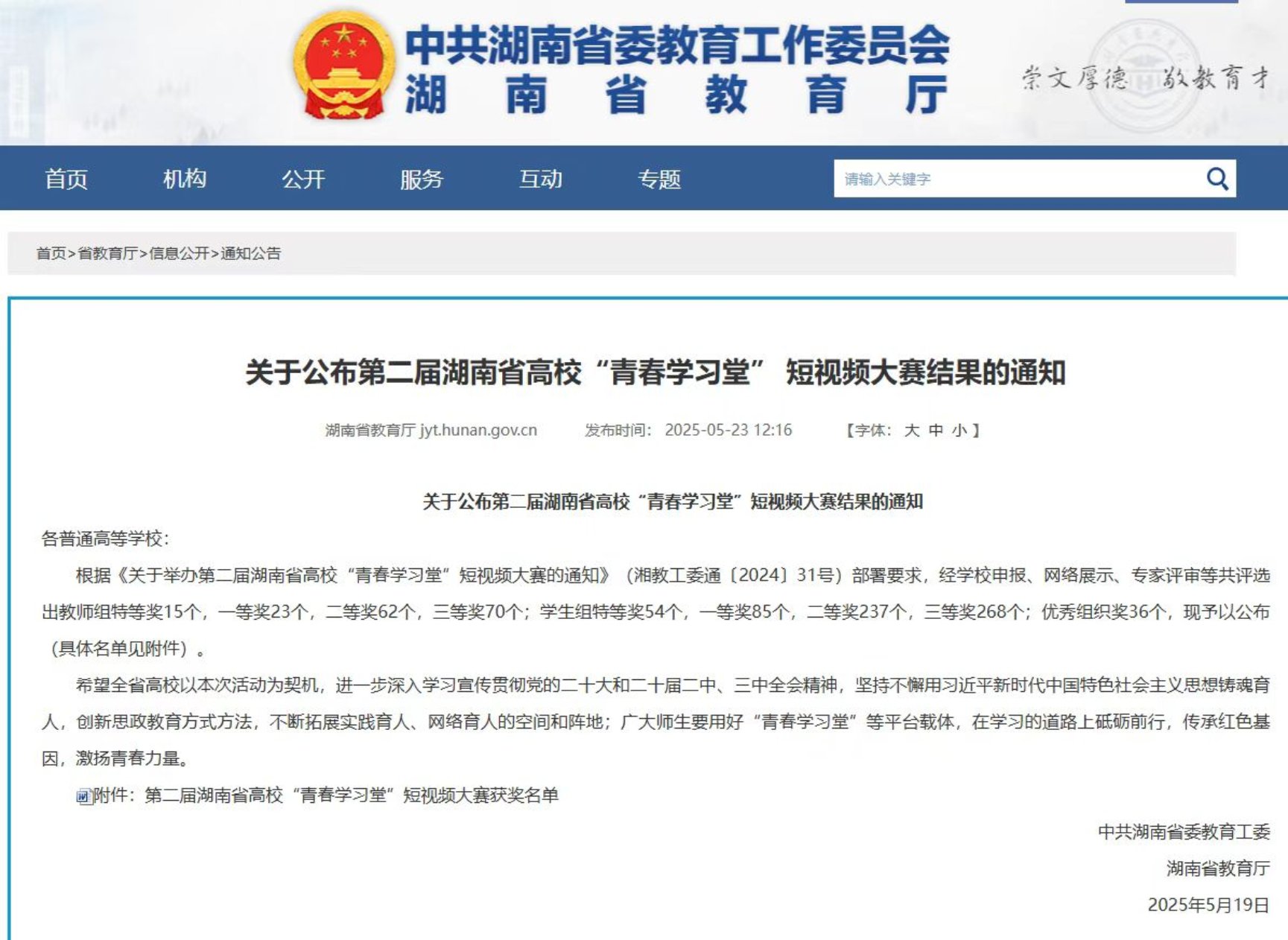 刘鄂老师带领学生在第二届湖南省高校“青春学习堂”短视频大赛荣获二等奖
