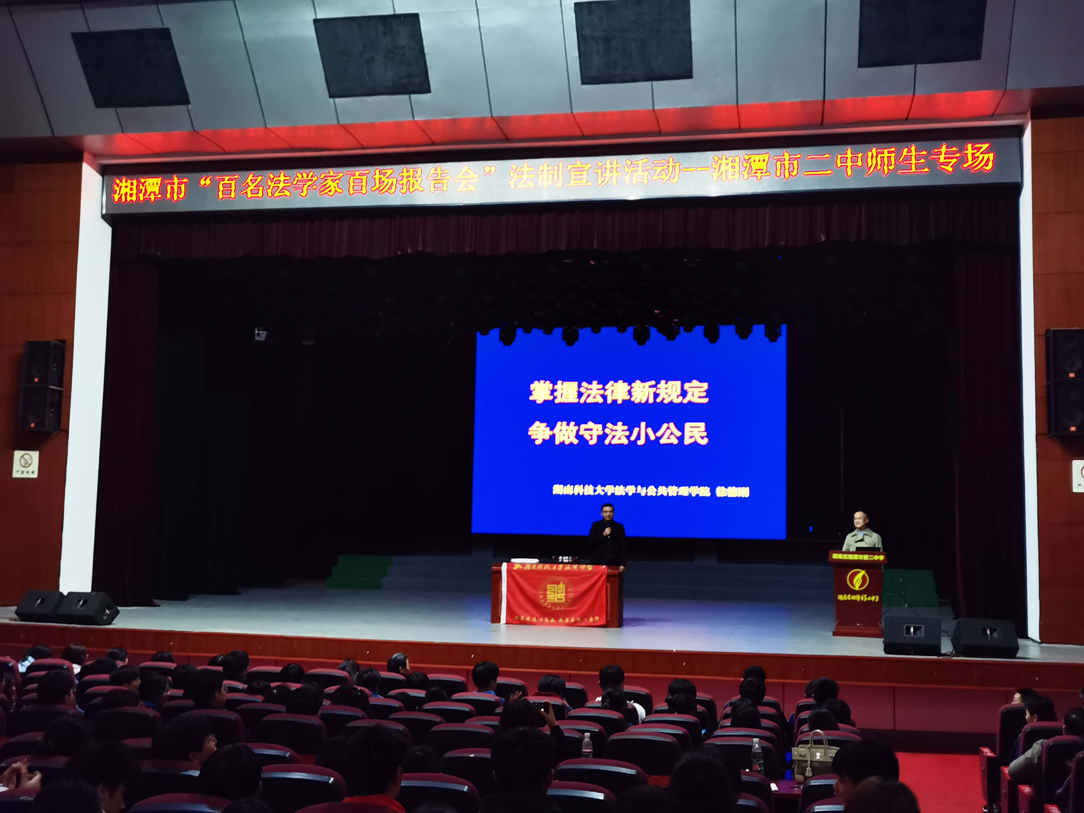 为深入学习、宣传和贯彻习近平法治思想,增强中学师生法治意识,2023年03月23日,湘潭市“百名法学家百场报告会”法治宣讲活动——-湘潭市二中师生专场于下午4:30在湘潭市二中艺术楼三楼演艺大厅举行。芭乐视频
