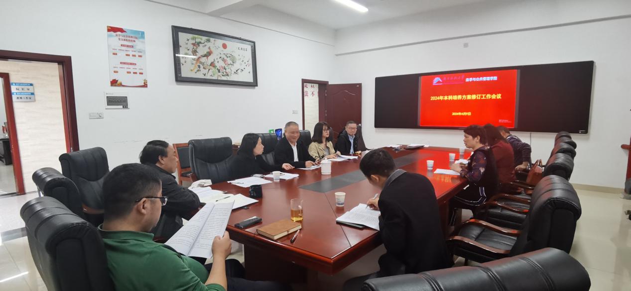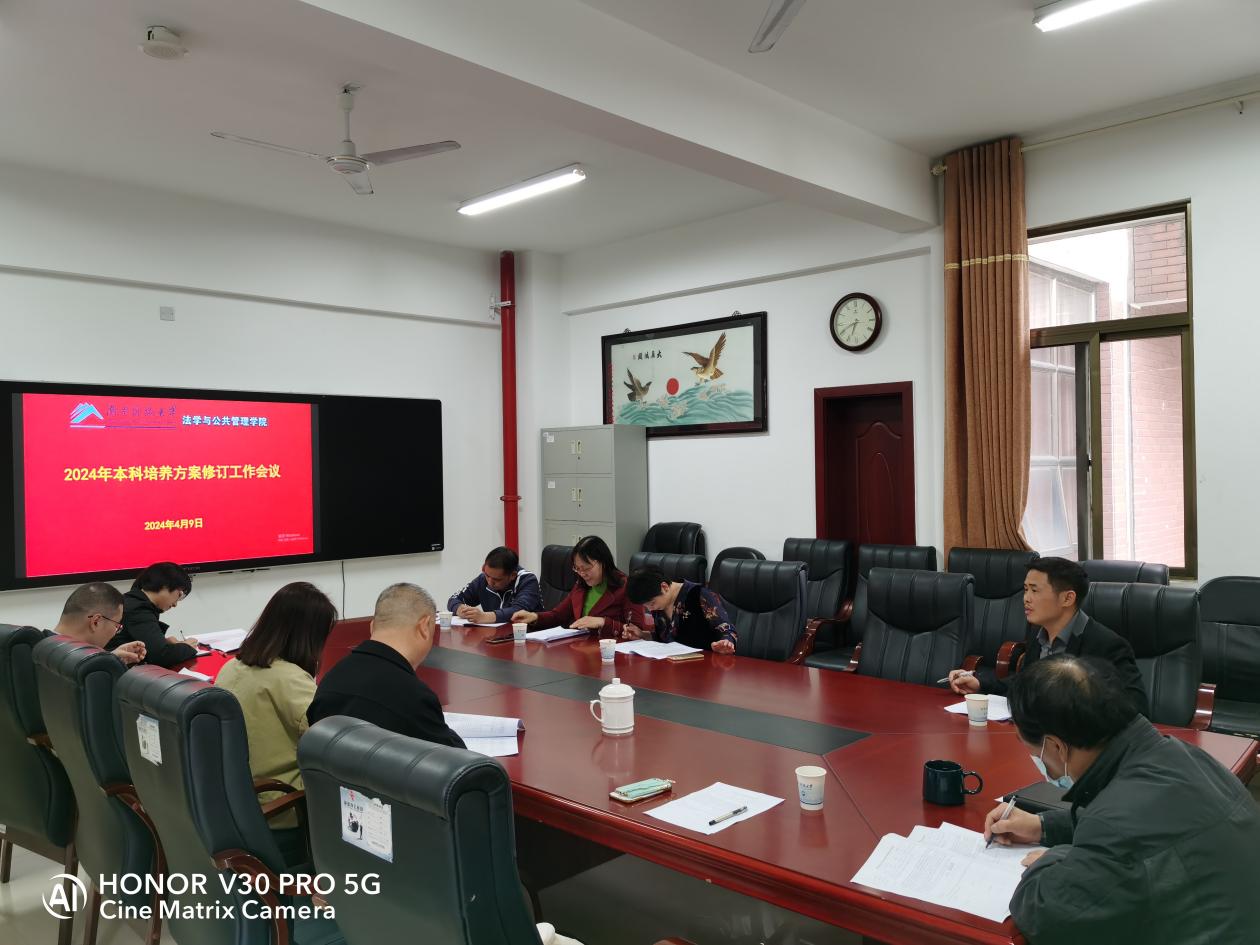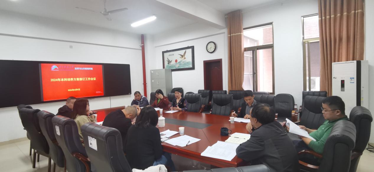 在立言楼A427召开2024年本科专业人才培养方案修订工作会议,会议由教学副院长王明主持,院党委书记郑海祥、院长邱帅萍、副院长宋智敏、法律服务中心主任马驰升及学院本科培养方案修订工作组成员参会。