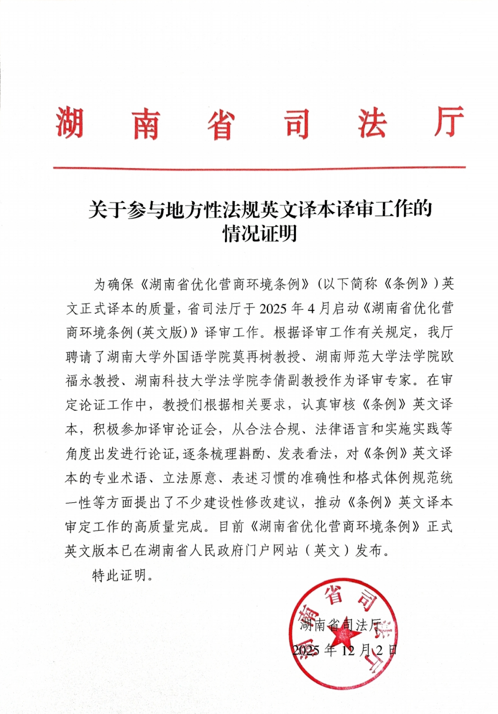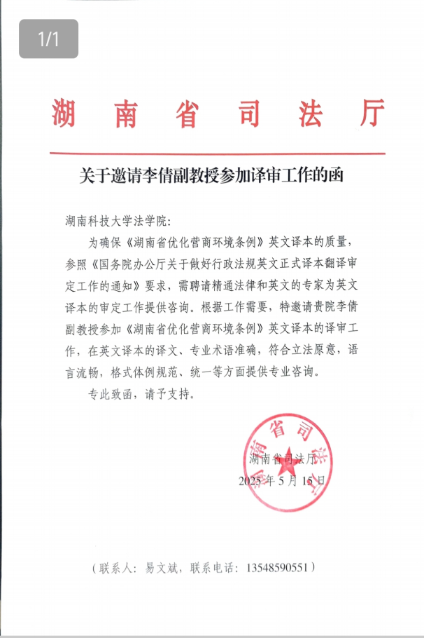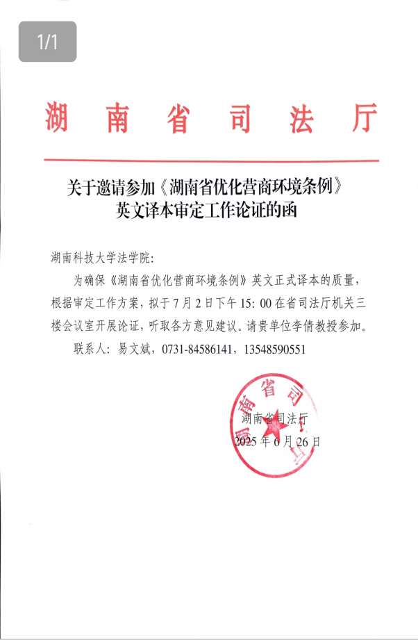 李倩副教授与湖南大学外国语学院院长莫再树教授、湖南师范大学法学院副院长欧福永教授一同受邀负责《条例》英文版译审工作。近日,该条例英文本《Regulations of Hunan Province on Optimizing the Business Environment》已获湖南省人民政府正式发布。(详见//fgw.hunan.gov.cn/fgw/xxgk_70899/zcfg/dfxfg/202510/t20251014_33824922.html)