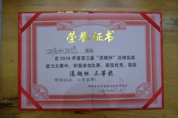 代表队作为庭一被告方,最终以94.62的高分,在参赛的十二个代表队中排名第三,并获得团体三等奖的好成绩。其中,张益同学获“杰出诉讼能力”一等奖,王静同学获“杰出书记员”二等奖,徐磊同学获“杰出诉讼能力”三等奖。刘敏老师个人也荣获“杰出指导能力”二等奖。 第三届漾翅杯法律实践能力大赛,响应了中国法学会“法治文化进校园”的要求,通过法律实践能力竞赛,面向当代大学生弘扬法治精神,传播法律知识。芭乐视频