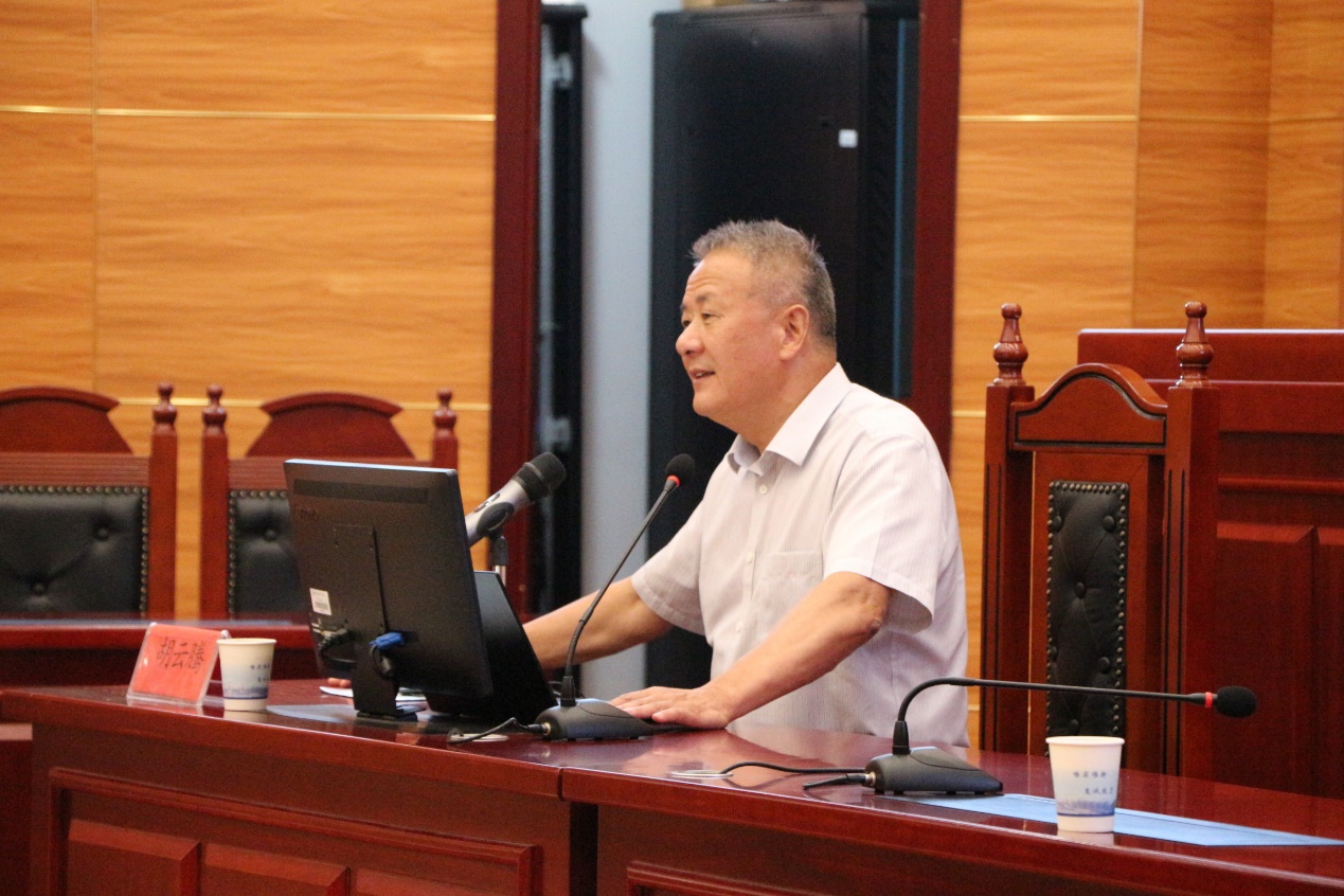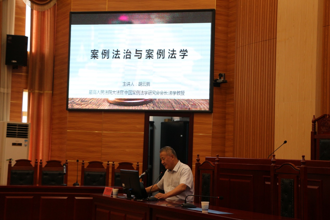 湘江高端学术论坛在立言楼模拟法庭举办。中国法学会案例法学研究会会长、最高人民法院二级大法官、最高人民法院审判委员会原副部级专职委员胡云腾教授应邀出席论坛并做“案例法治与案例法学”主题讲座。