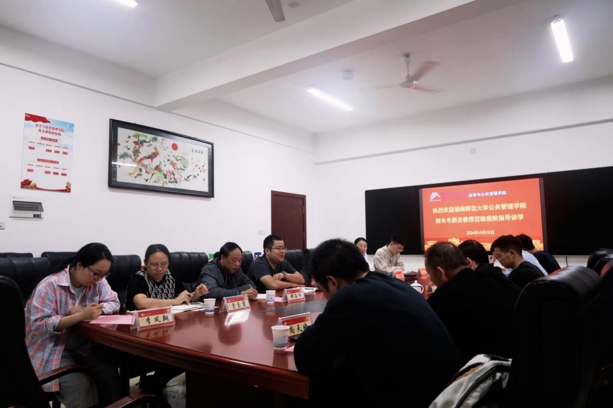 公共管理学科及MPA发展的相关情况后,毛新志教授就公共管理学科建设与MPA发展进行了深入的探讨和指导,详细分享了湖南师范大学MPA建设的历程、经验和心得体会,并对学位点建设、师资队伍、方向设置、案例开发、招生宣传、审核评估等方面提出了具有针对性的建议。