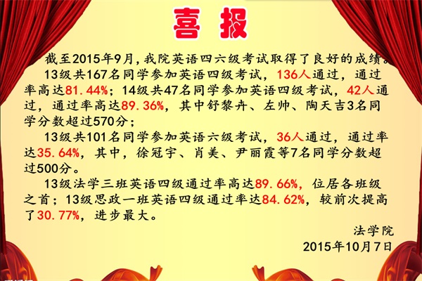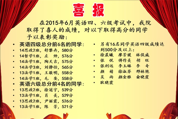 英语四六级考试取得了喜人的成绩: 13 级共167名同学参加英语四级考试,136人通过,通过率高达81.44%;14级共47名同学参加英语四级考试,42人通过,通过率高达89.36%,其中舒黎卉、左帅、陶天吉3名同学分数超过570分; 13 级共101名同学参加英语六级考试,36人通过,通过率达35.64%,其中,徐冠宇、肖美、尹丽霞等7名同学分数超过500分。 13 级法学三班英语四级通过率高达89.66%,位居各班级之首;13级思政一班英语四级通过率达84.62%,较前次提高了30.77%,进步最大。 对以下取得高分的同学予以表彰奖励: 英语四级总分前6名的同学: 14 思政2班,舒黎卉,580分 14 哲学1班,左 帅,576分 14 法学1班,陶天吉,575分 14 法学3班,刘静怡,565分 13 法学1班,王敬明,558分 14 法学1班,毛 娈,558分 英语六级总分前4名的同学: 13 思政2班,徐冠宇,539分 13 法学1班,肖 美,529分 13 思政2班,尹丽霞,526分 13 法学1班,陈 芳,521分 另有16名同学英语四级成绩达到500分及以上: 徐晨曦 廖芳媛 林俣威 张 悦 傅作美 胡 旺 张利远 李玉琳 李 奇 颜 婧 徐淑芬 邢林艳 吴 雨 颜金雅 俞晓霞 耿晓霞 法学院 2015 年10月7日 (责任编辑:admin) |