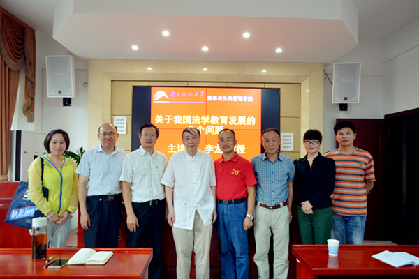 指导,并于文科楼A425会议室开展以“关于我国法学教育发展的几个问题”为主题的讲座。院长徐德刚担任主持,党委书记黄伟、副院长胡正昌、副书记叶军、专业老师李云霖、夏飞明、胡之芳、李倩和15级法学专业学生到场学习。 “法学最早研究的是人的行为规则,‘法典是人民自由的圣经’,我们研习法律,一方面希望确认和保障公民自由权利,另一方面也是确保公民正确行使自由权利。”李龙教授详细为大家讲述了法学教育的发展历程,从春秋子产造刑书到中国历史上第一部较完整的封建社会法典《法经》的制定, 从三国魏明帝时设律博士职专门传授法学到晚清法学家沈家本仿照西方模式修订法律。 “曾经的法学本科教育是有专业区分的。上世纪90年代末,国内法学本科教育改革呼之欲出。我当时曾指出,中国法学教育改革的关键在于更新法学教育观念,即摒弃从苏联沿袭过来的‘对口教育’理念,转而探求法学素质教育,着重培养学生的能力,并提出将过去分散的几个法学专业合并成一个法学本科专业。”李龙教授由此告诫大家在法学发展的新阶段要抓住机遇,并以新姿态、新思想去研究新问题。 结合当代法学教育问题的现状,徐德刚院长虚心请教:“老师应如何加强对本科生的培养以及法科生的未来趋势会是怎样的?”李龙教授答道:“我常常对我的学生提出‘三要求’,倡导‘三精神’。 ‘三要求’即要博览群书,要勤于思考,要笔耕不辍;‘三精神’即夯实基础理论的勤奋精神、联系现实问题的批判精神以及开拓理论前沿的探索精神。同时我们要看到法学的前途,积极奋斗,永不服输。”至此,讲座圆满结束。 (责任编辑:admin) |