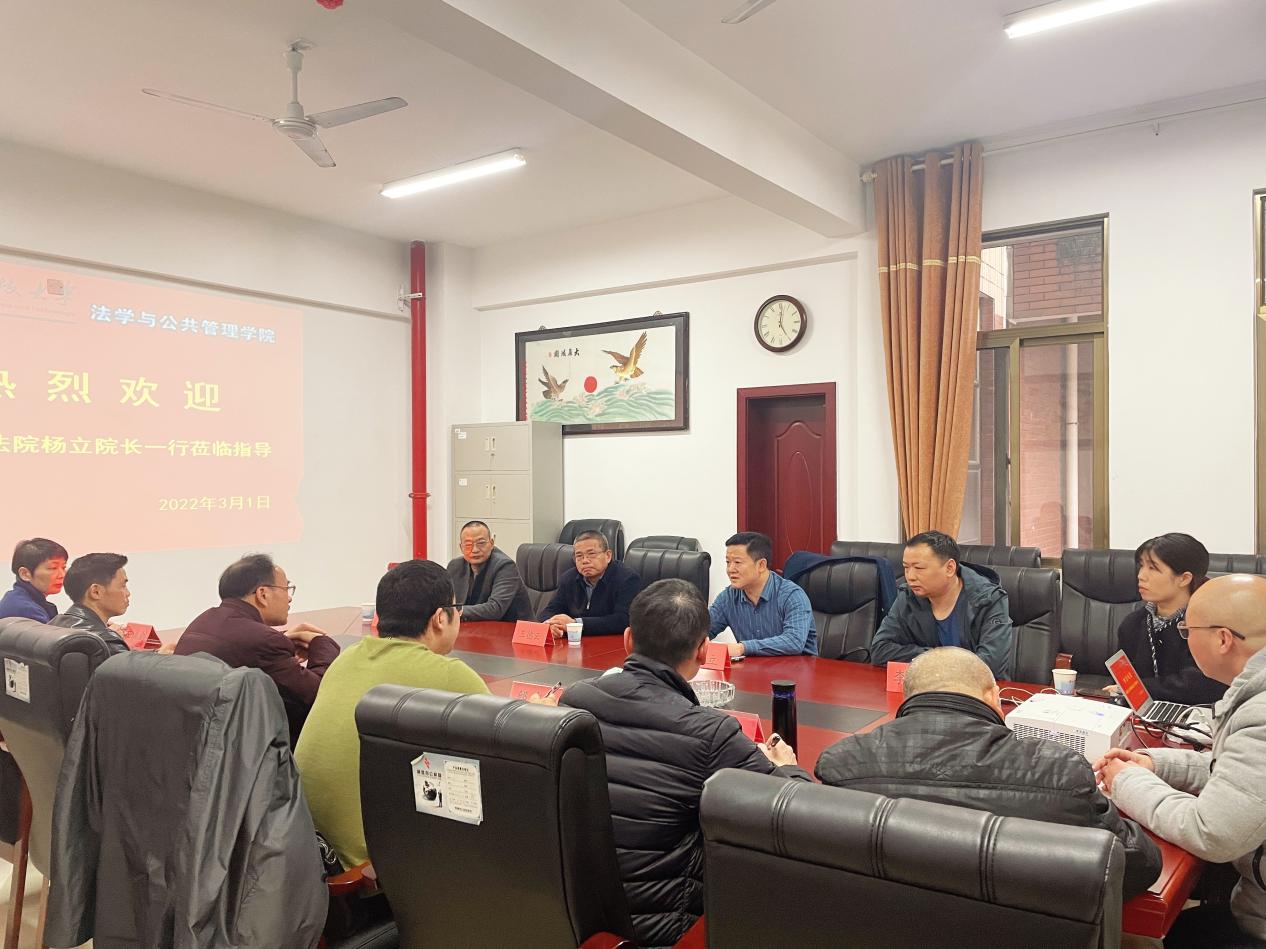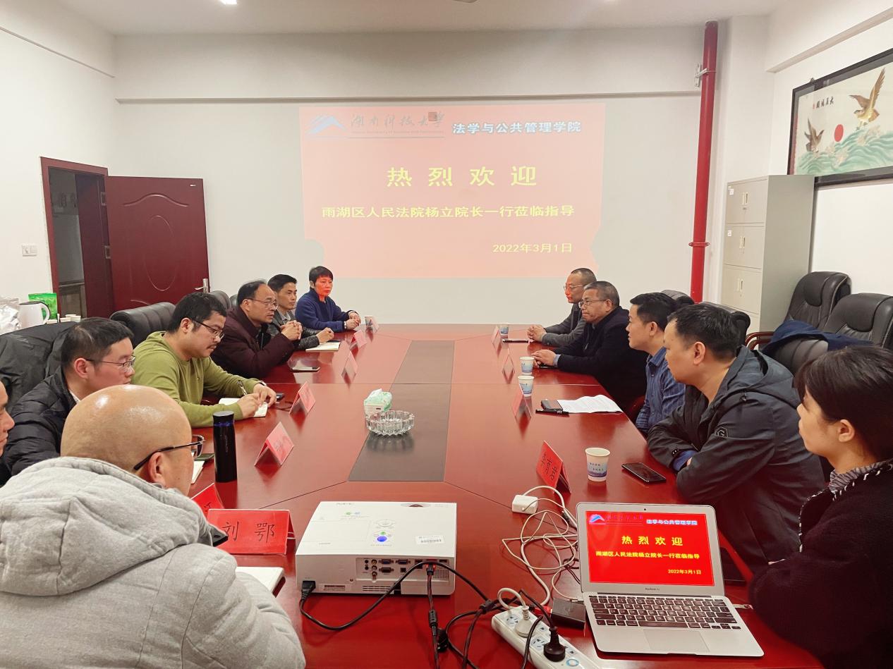 与湘潭市雨湖区人民法院的合作在大学生诉讼引导志愿活动、庭审进校园等方面取得了较大成功。为进一步深化院校合作,加强双方联系,2022年3月1日下午,雨湖区人民法院党组书记、院长杨立,副院长王德云,政治部主任方刚,执行局局长李育君,民二庭庭长暨立春等莅临芭乐视频